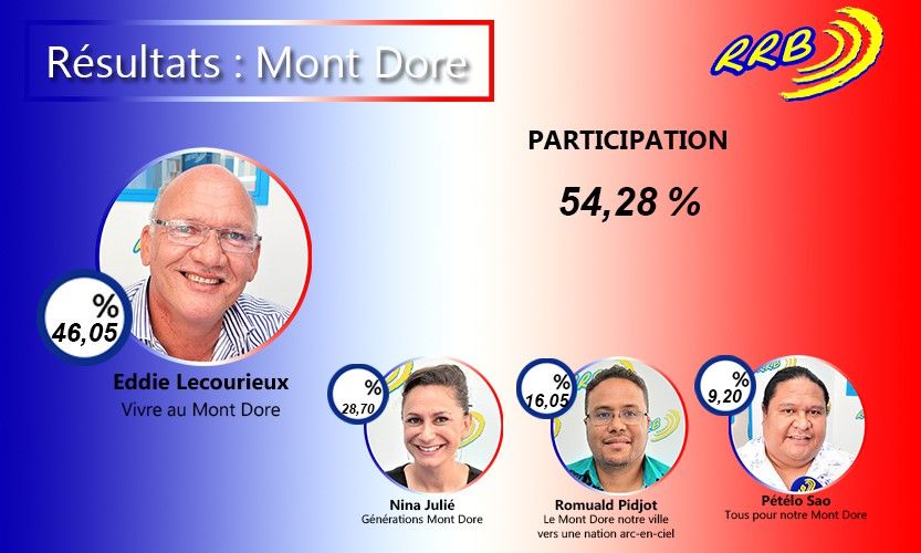 Eddie Lecourieux a recueilli 46,05% des voix. Le maire sortant devance Nina Julié qui a obtenu 28,70% des voix. Romuald Pidjot est à 16,05%, enfin Petelo Sao a réalisé un score de 9,20% des suffrages.